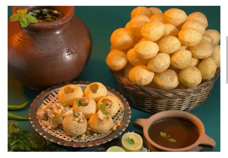 Gol gappa: (also known as pani puri) is a popular bite-size chaat consisting of a hollow, crispy-fried puffed ball that is filled with potato, chickpeas, onions, spices, and flavoured water, usually tamarind or mint, and popped into one’s mouth whole.